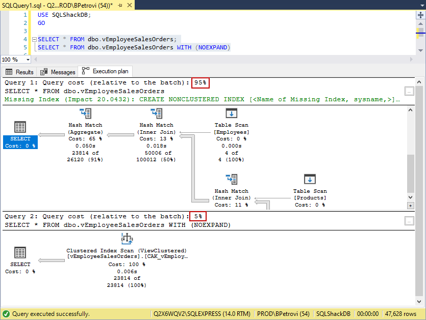The first thing that we’ll do is create an indexed view. We will, of course, use the CREATE VIEW SQL statement for this as we did many times through the series. But the general idea, as the title says, is to see how to work with indexed views, see what the requirements are for adding an index to a view, and how to do it programmatically. Furthermore, to explain the pros of indexed views, we’ll be looking at executions plans in SQL Server. They are a great tool for DBAs and developers when it comes to finding and fixing a bottleneck in the slow running query.