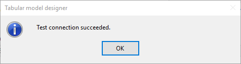 The exact name of the SSAS Tabular instance must be input into the Workspace server text field, otherwise, it won’t be possible to create a project. To make sure the connection is valid, press ‘Test Connection’ button. After validation, if successful, message states: