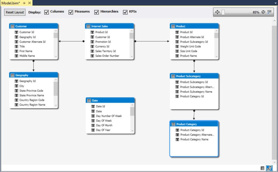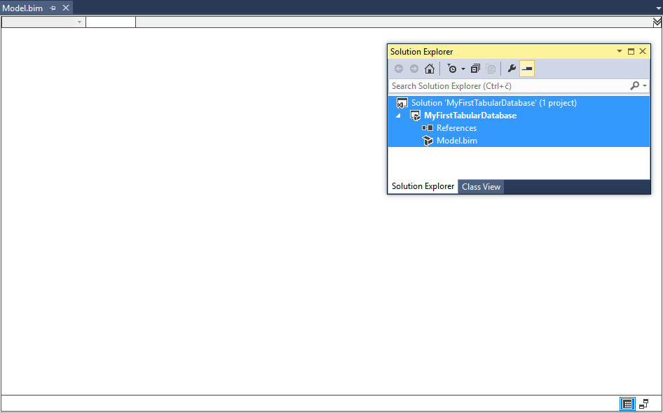 The most important part of this project is Model.bim, which is the skeleton of the future SSAS Tabular model database. In further steps, this file will be populated with necessary elements and, in the end, deployed into Analysis Services instance.