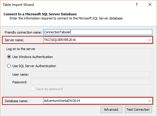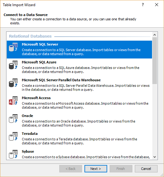 Select the option ‘Import from Data Source’, placed in Model menu, and Table Import Wizard shows. In this article, the source connection will be Microsoft SQL Server.