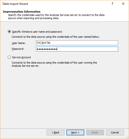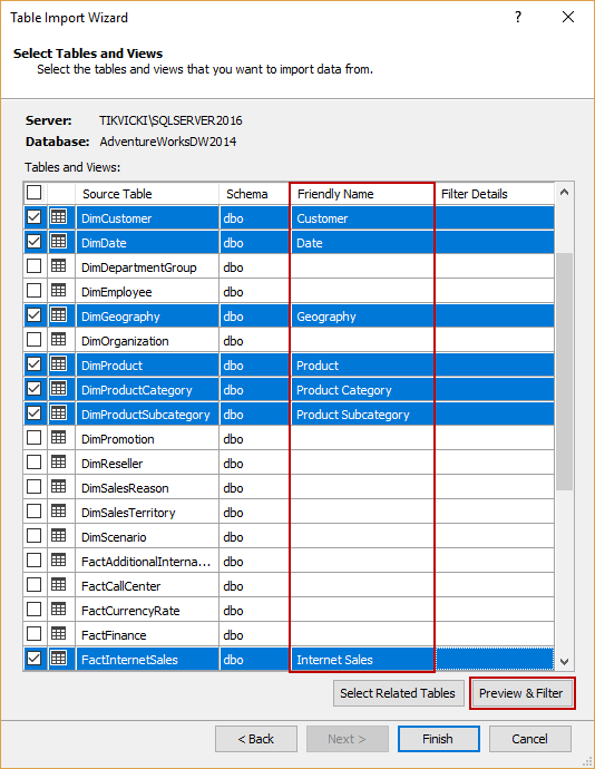 Important notice: Until the tables are reviewed, properly renamed and filtered, ‘Finish’ button should not be pressed, because there will be a lot of redundant data, and the Tabular model database itself may be larger than expected.