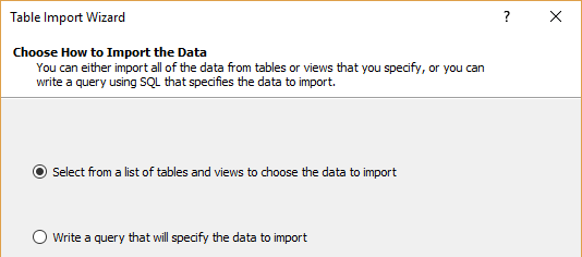 In picture above, there are two methods of importing data, through querying the tables (intermediate knowledge of T-SQL is required) or selecting from the tables list (easier and used in this article).