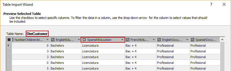 As shown in this picture above, the table DimCustomer needs filtering (the friendly name for this table will be applied later), by unchecking the redundant columns. In this case, the redundant columns are related to translated columns that resembles the column e.g. EnglishEducation (like SpanishEducation, HebrewDescription etc.). This applies for all of the tables, separately. The purpose of filtering is reducing the size of the future Tabular database, which will improve its performance.