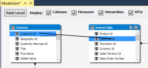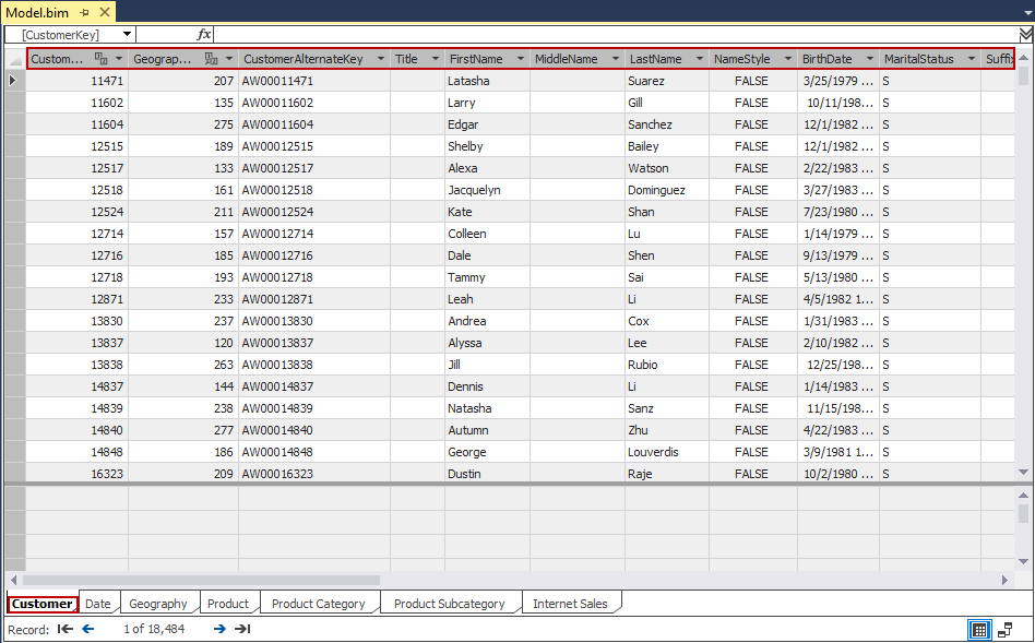 After renaming and importing the tables into Model.bim, the columns in these tables also must get the Friendly Names. Imported tables are placed in tabs, as shown in the picture.