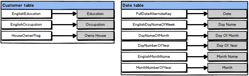 Columns that contain “-Key” in title should be changed with “Id” (CustomerAlternateKey -> Customer Alternate Id, e.g.)