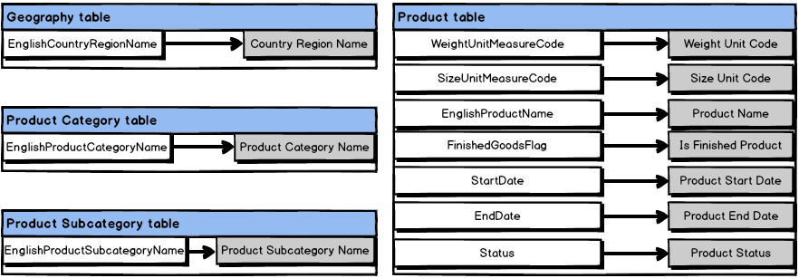 Table FactInternetSales (with Friendly Name Internet Sales) needs removal of particular columns: OrderDateKey, DueDateKey, ShipDateKey.