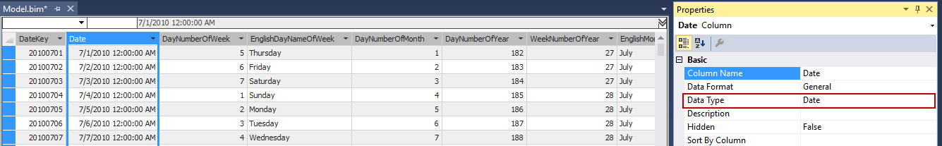 While renaming of the columns is in process, creation of the Date dimension table can also take place. Make sure that Data type of Date column (formerly FullDateAlternateKey) is like shows in Properties: