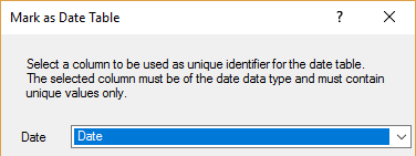 After that, select the Date column (if not checked) and click the option Mark as Date table (in Table menu). Make sure that column as a unique identifier is Date in following dialog:
