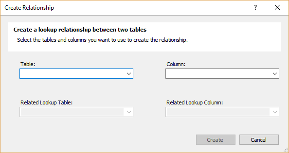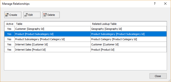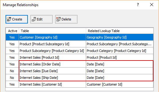 If some of these relationships are missing, add them within Manage Relationships modal dialog, clicking the Create button, where the related tables and columns define: