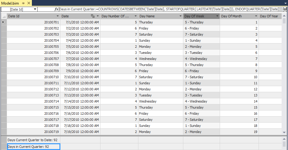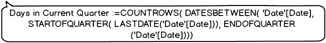 Create one more measure in the Date table, Days in Current Quarter, with corresponding formula, placed under the previous measure:
