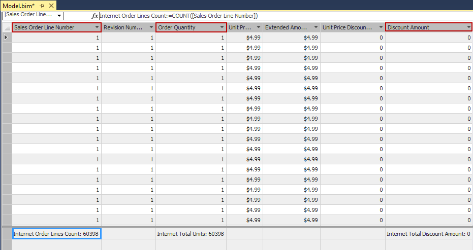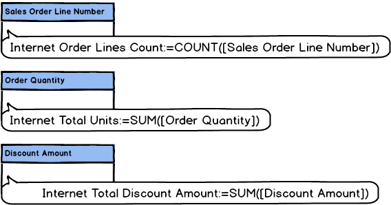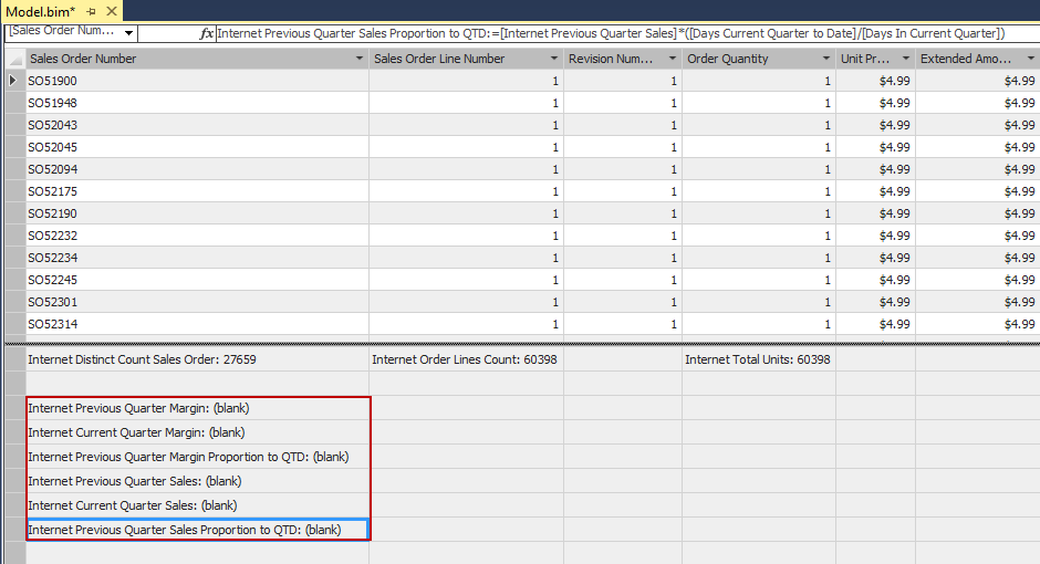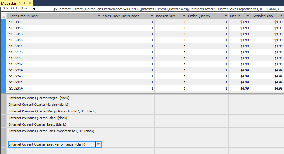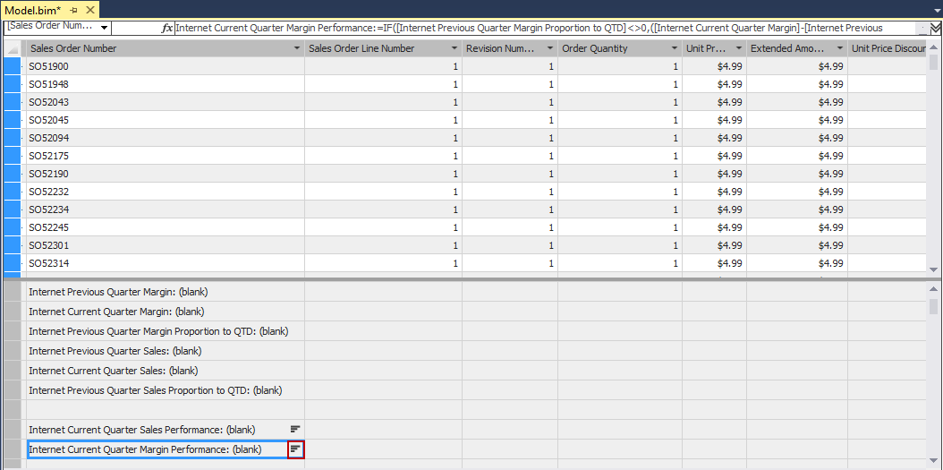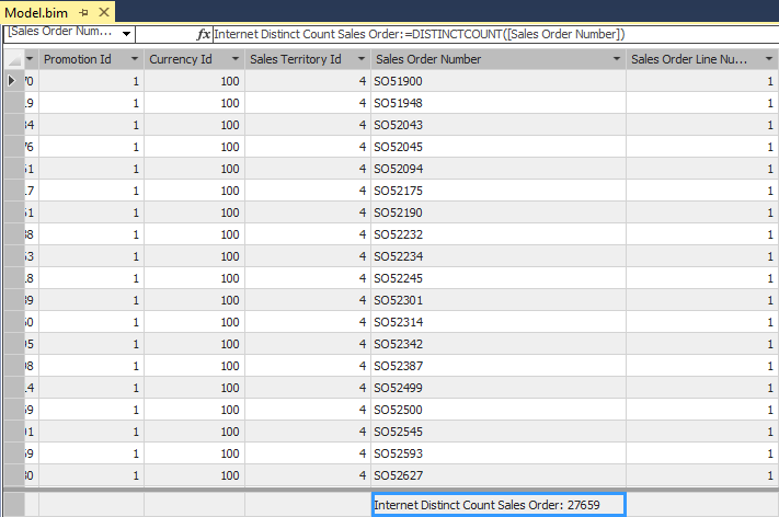 Click a cell in the measure grid beneath Sales Order Number, and apply the following formula, as shown: