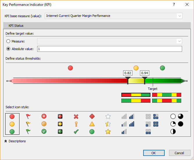 To create KPIs, use the same method as for creating measure (any cell in the measure grid), with this input in formula bar: