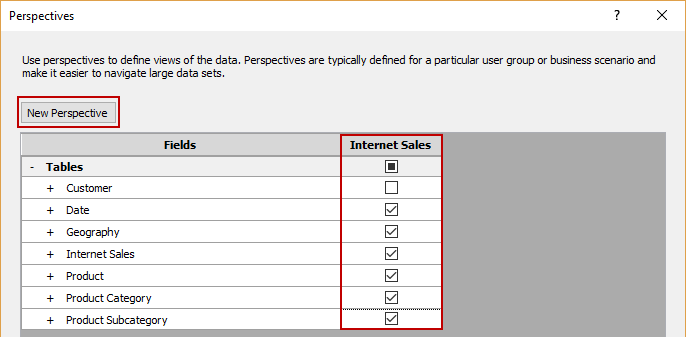 As displayed, select all tables except Customer. After that, verify that Perspective is present:
