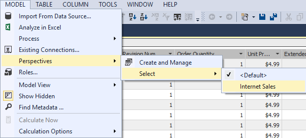 For this database, create one Perspective, titled Internet Sales, through Create and Manage option (in Model ➜ Perspectives menu)