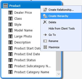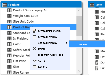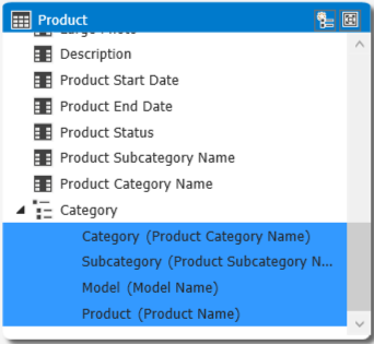 Title the hierarchy as Category, right-click the following columns and add them to this hierarchy in specified order: Product Category Name, Product Subcategory Name, Model Name and Product Name: