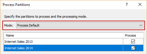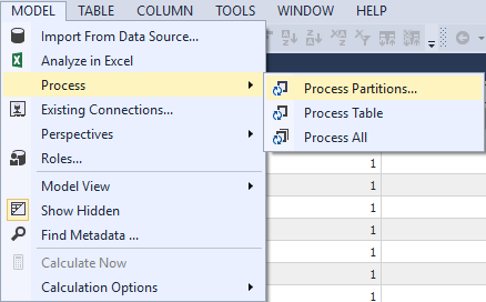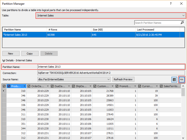To create Partitions, select the Internet Sales table, and select the Partitions option (in Table menu). Check the Table (that Internet Sales is selected) and customize Partition name (add ‘2013’).