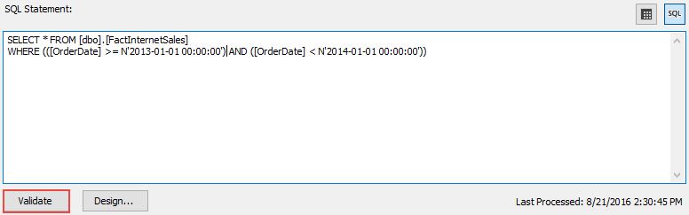 After that, click the ‘SQL’ button, add the following T-SQL code into the text box, and validate the code: