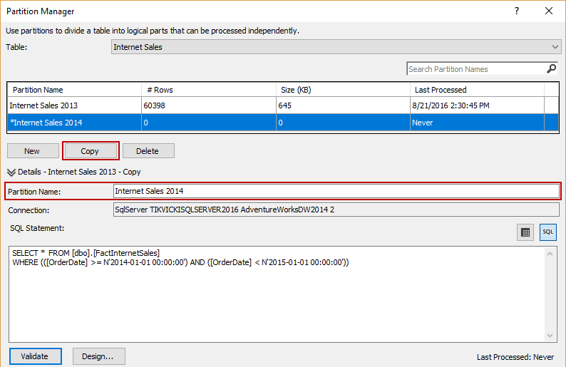 Copy the existing partition, change its name, and change the particular part of the code, in order to create Internet Sales 2014 partition: