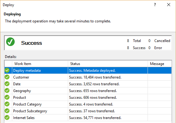 Finally, deploy the Tabular model database into the Analysis Services instance.