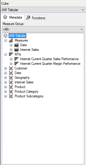 To make sure that new SSAS Tabular model database is deployed, check for it in SSMS. After connecting on Analysis Services Tabular instance, select the new database (for this time, the Tabular database in this article is named ‘AW Tabular’), and query it. This docked window should appear: