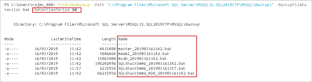 >Find-DbaBackup -Path 'C:\Program Files\Microsoft SQL Server\MSSQL15.SQL2019CTP\MSSQL\Backup\' -BackupFileExtension bak -RetentionPeriod 3d |