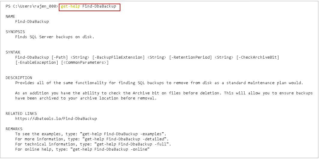 We can get a list of all database backup files placed in a directory using Find-DbaBackup command. It is good practice to get information about particular command before we start exploring it.
