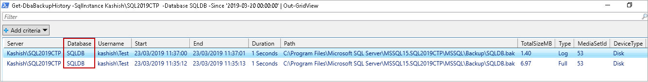 >Get-DbaBackupHistory -SqlInstance Kashish\SQL2019CTP -Database SQLDB -Since '2019-03-20 00:00:00' | Out-GridView |