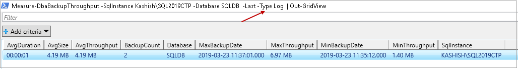 >Measure-DbaBackupThroughput -SqlInstance Kashish\SQL2019CTP -Database SQLDB -Last -Type Log | Out-GridView |