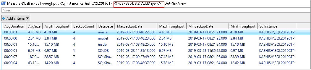 >Measure-DbaBackupThroughput -SqlInstance Kashish\SQL2019CTP,Kashish\SQL2019 | Out-GridView |