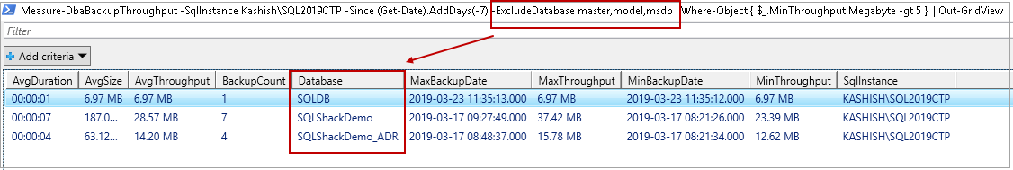 >Measure-DbaBackupThroughput -SqlInstance Kashish\SQL2019CTP -Since (Get-Date).AddDays(-7) -ExcludeDatabase master,model,msdb | Where-Object { $_.MinThroughput.Megabyte -gt 5 } | Out-GridView |