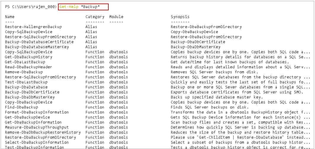We can get information about commands related to any particular keyword using Get-Help command. In the following screenshot, you can all commands related to keyword backup.