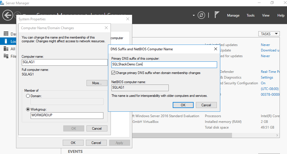 Click on More. It opens the DNS suffix and NetBIOS Computer Name. Enter the primary DNS suffix of the computer. For this article, I use SQLShackDemo.com DNS suffix.