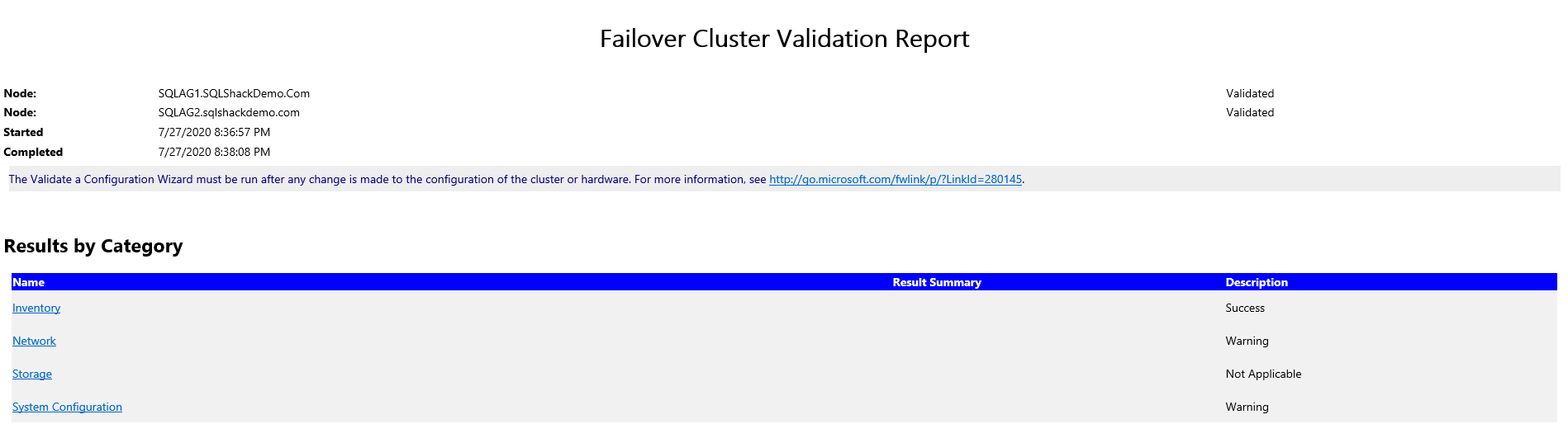 It performs the cluster validations. Open the report and view for any issues. You should fix these issues before creating the cluster. You can get a validation warning for the active directory because our servers are not a member of the active directory domain. It is OK to ignore these warnings.