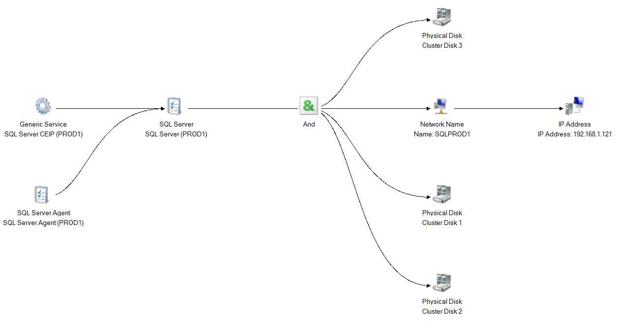 In the above screenshot, you can see the dependency report doesn’t display our shared disks at all. In other words, it thinks SQL Server is not directly dependent on shared disks but behind the scenes, SQL Databases still reside on that CSV disk(s). The important thing to understand with CSV deployments is our SQL Server Instance availability still depends on CSV disk (After all that’s where our Databases are residing), but it’s getting abstracted. Compare the above screenshot with the dependency report from a traditional failover cluster Instance setup.