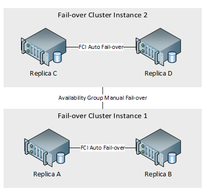 Using a hybrid approach of this type adds much complexity. Beyond the manageability of a more complicated architecture, AG automatic fail-over is not possible in this configuration. The only automatic fail-over that is supported will be at the instance level, performed by the FCI. This means that automatic fail-over cannot be configured to move different AGs from the same instance to separate instances. The whole instance will move. Another concern is that only a single instance with an AG can ever reside on a node of the cluster. To state it another way, if you have more than one instance in the cluster with an AG, then they must be configured to only move between nodes which are not possible owners of the other. To achieve automatic fail-over in a cluster with two FCIs, you will need a minimum of four nodes which might make a strong case for simply splitting them into two separate clusters to begin with.