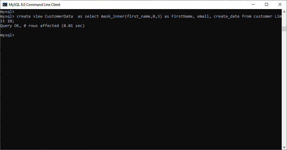 mysql> create view CustomerData as select mask_inner(first_name,0,3) as FirstName, email, create_date from customer Limit 10;