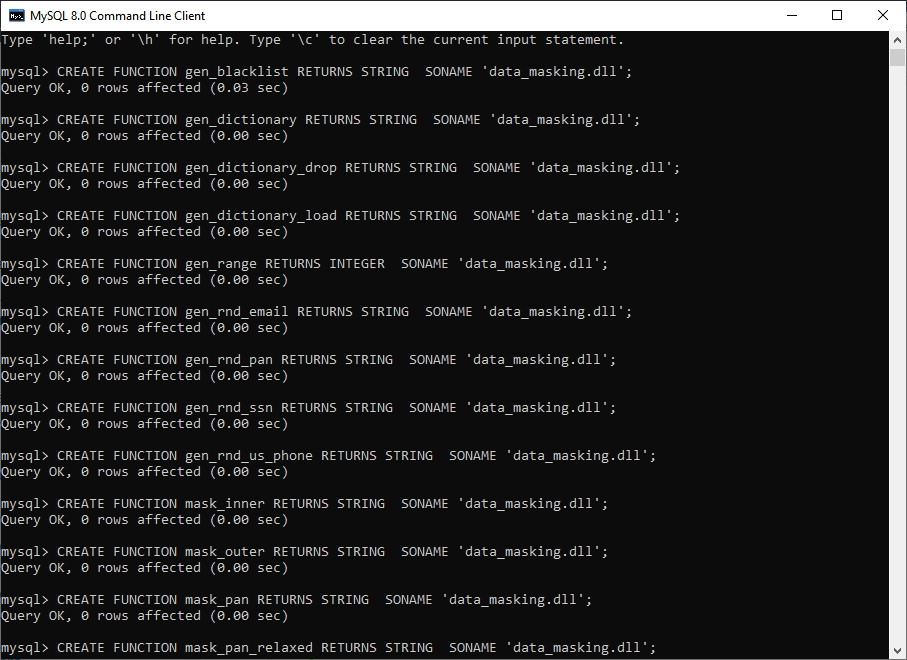 INSTALL PLUGIN data_masking SONAME ‘data_masking.dll’;