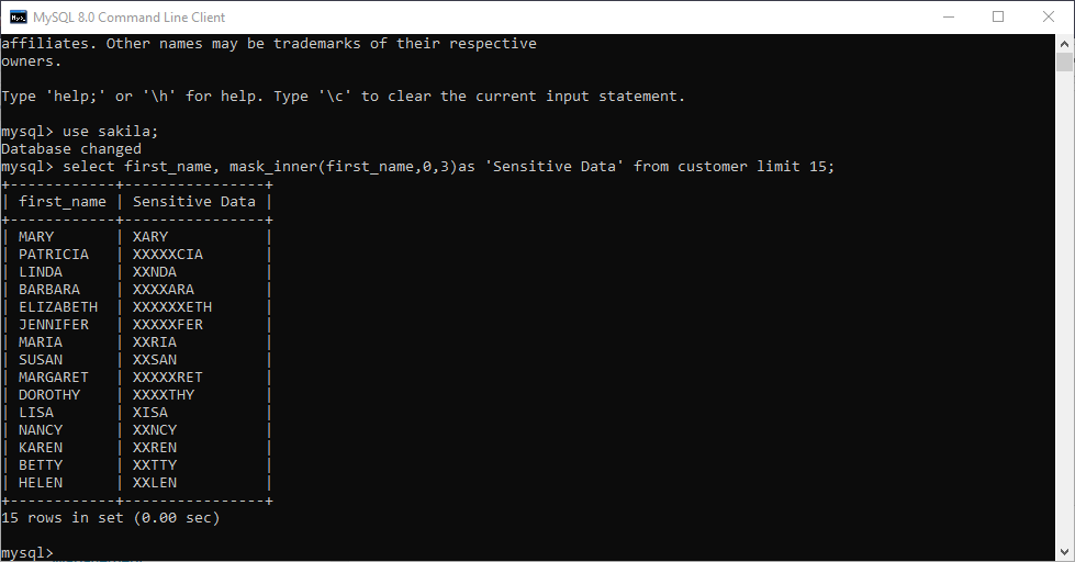 mysql> select first_name, mask_inner(first_name,0,3)as ‘Sensitive Data’ from customer limit 15;
