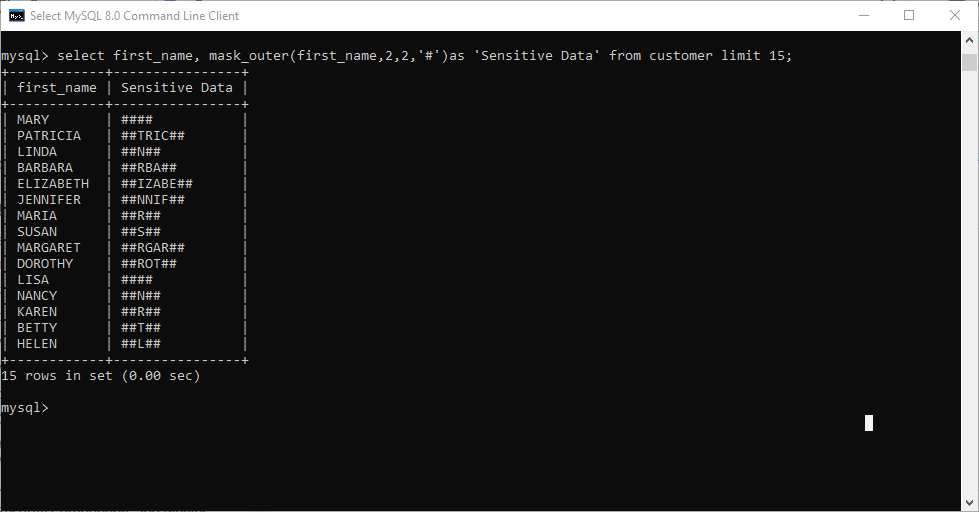 mysql> select first_name, mask_outer(first_name,2,2,’#’)as ‘Sensitive Data’ from customer limit 15;