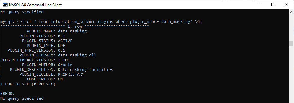 select plugin_name,plugin_status, plugin_type,plugin_description from information_schema.plugins where plugin_name=’data_masking’ \G;
