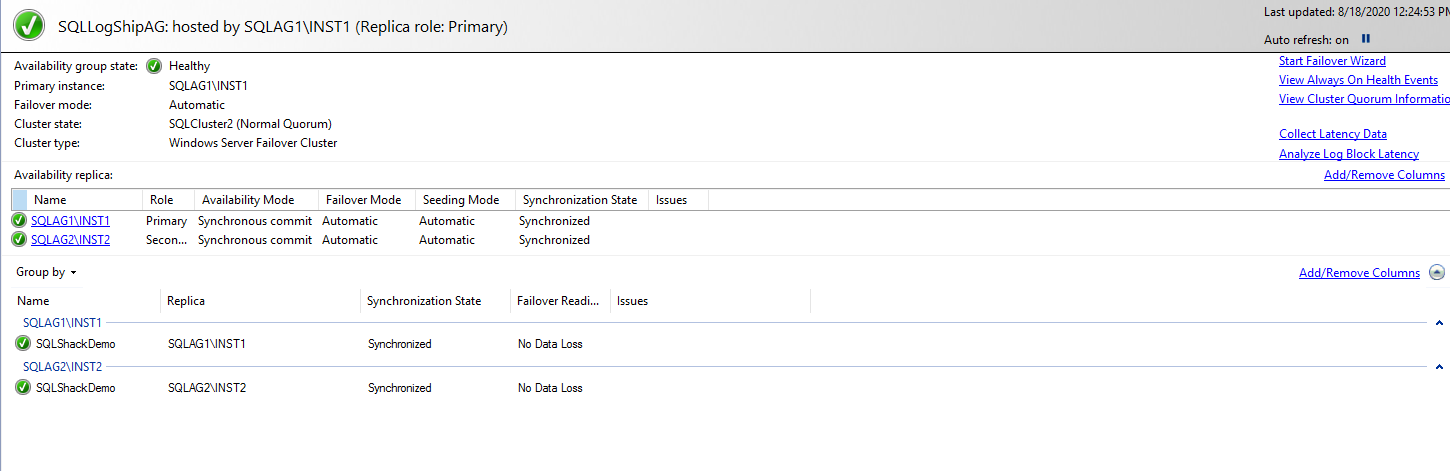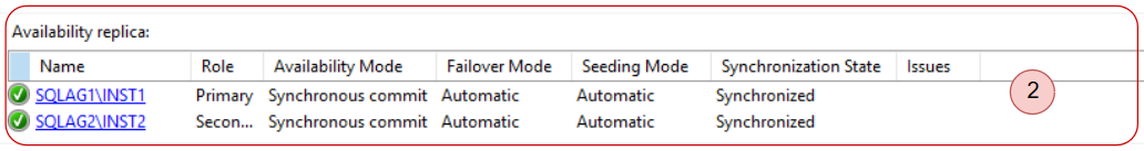 - AG replicas: It shows the configured AG replicas for the availability group. In my example, it shows two AG replicas SQLAG1\INST1 & SQLAG2\INST2