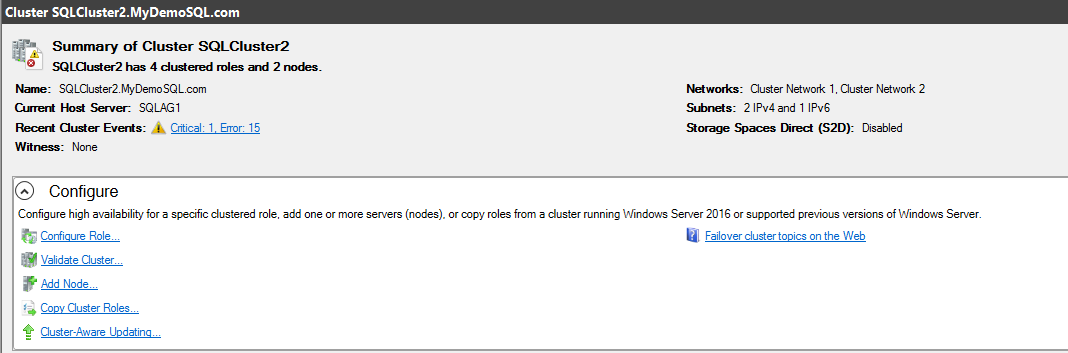 Cluster State: It shows the Windows cluster name and the quorum configuration. In my case, the failover cluster name is [SQLCluster2]