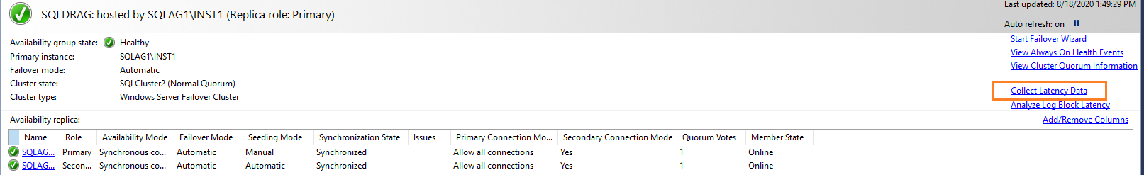 We can use this option to collect the latency bottleneck information between the AG replicas. Once you click on the collect latency data, it creates a SQL agent job AlwaysOn_Latency_Data_Collection and collects the relevant data for you.