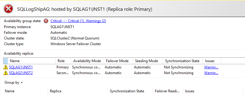 Availability group state: It shows the state of the AG. Currently, it is showing healthy. In case of any issues, it shows the status like below