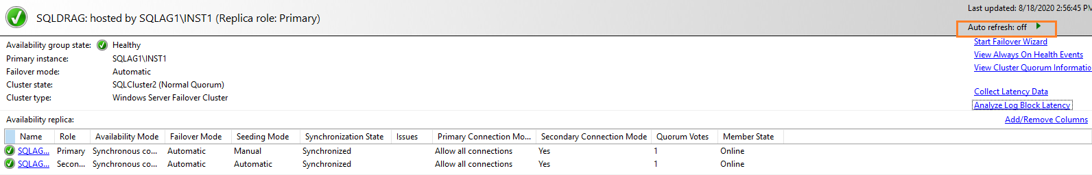 We can pause the auto-refresh from the dashboard. As shown below, the AG dashboard refresh is stopped.