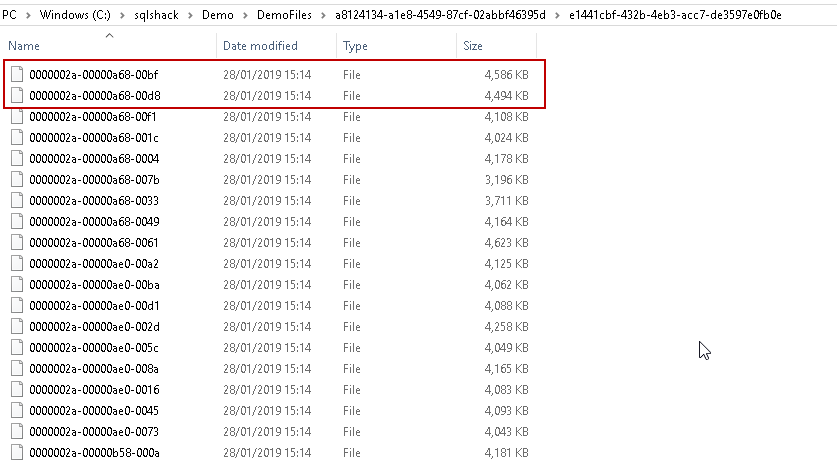 Suppose we have the following files stored in the SQL Server FILESTREAM container. First, we do not know the exact name of the files. SQL Server does not store the files in their original name. Instead, it assigns the names as per an internal mechanism.