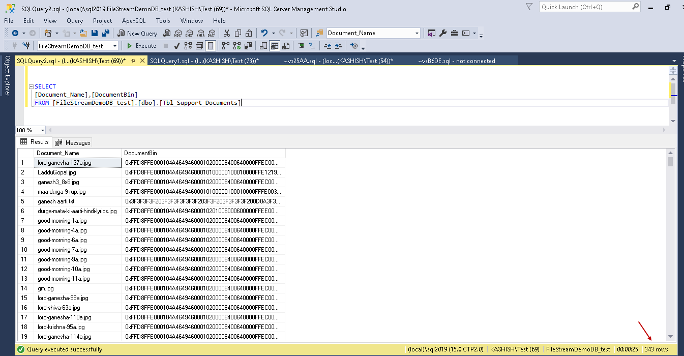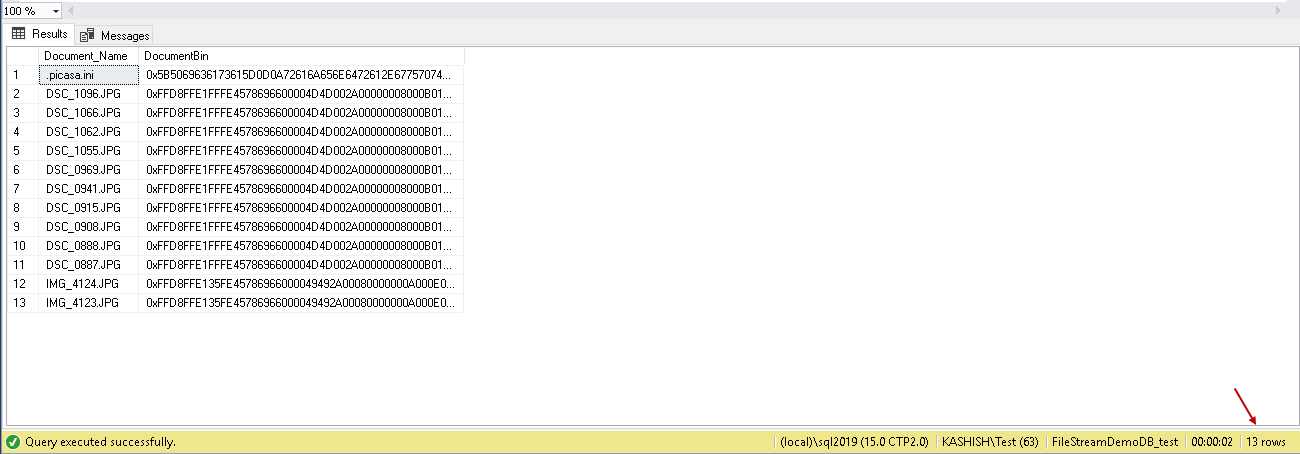 Let us perform the validations. We can see data in the FILESTREAM table (13 rows). It shows that Import is successful.