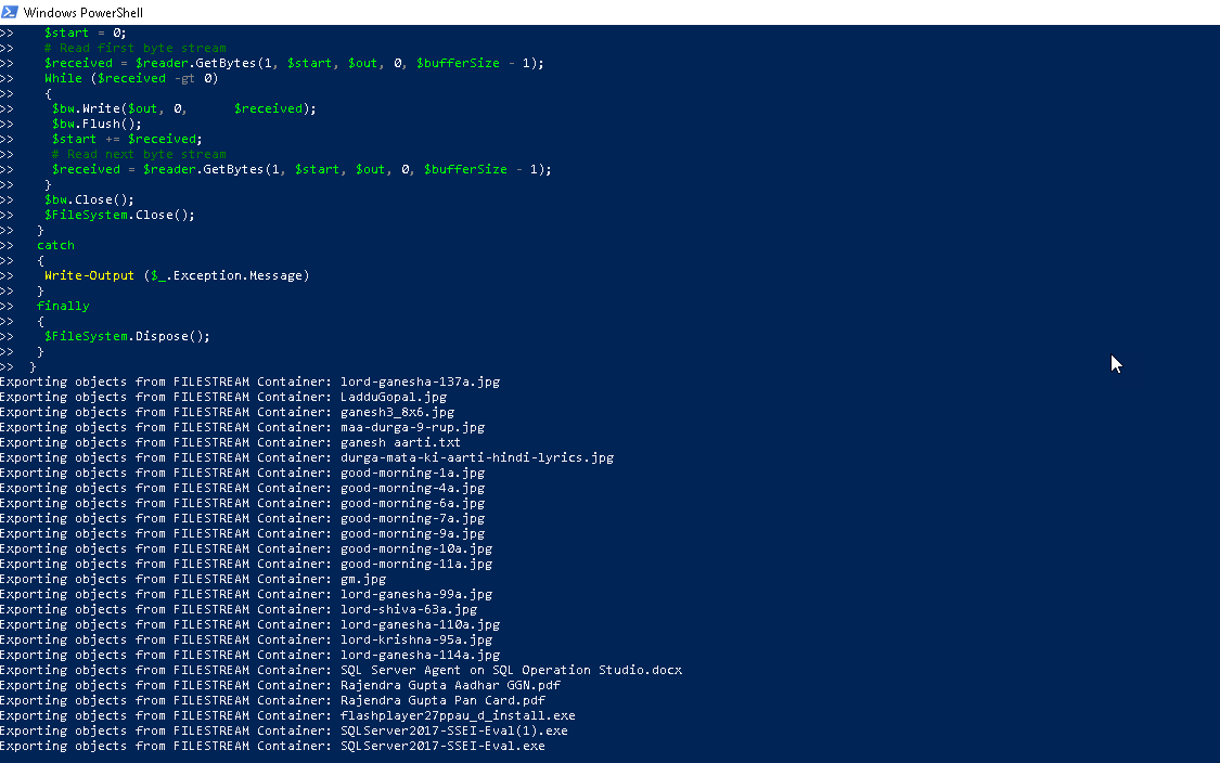 Now execute the query in PowerShell. It will start copying the files from the SQL Server FILESTREAM to the desired folder specified in the script. Script execution may take time depending upon the number of objects, their size, network bandwidth. You get the printed message in the PowerShell window for each file that is copied to the folder.