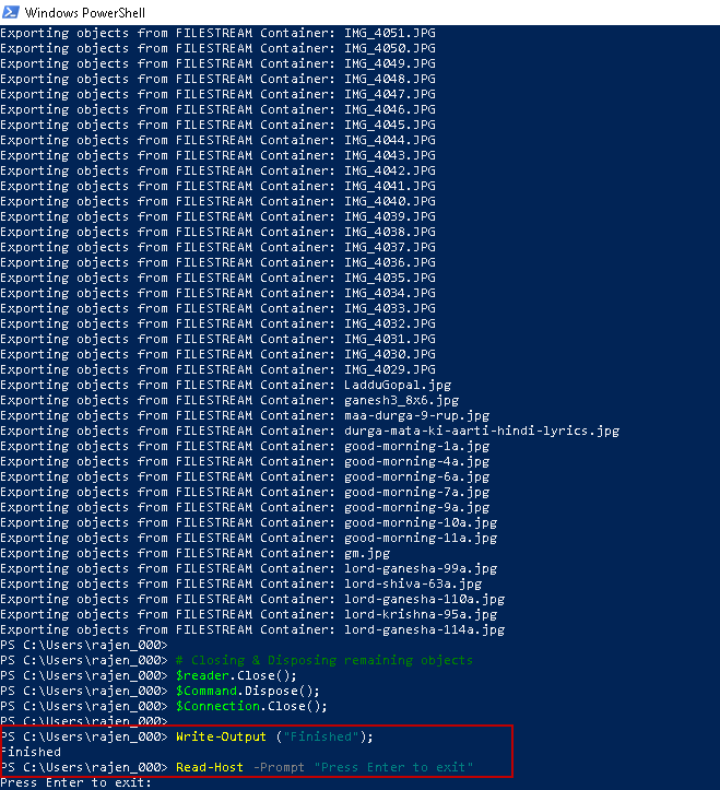 Once the script completes the files export from FILESTREAM container, you get the message ‘Finished’. We need to press ‘Enter’ to exit.