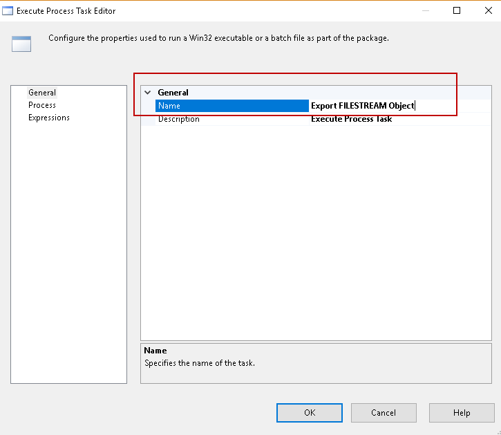 Double click on ‘Execute Process Task’ and it opens the execute process task editor. In this, rename the task to reflect its usage. We renamed it to ‘Export FILESTREAM Object’.